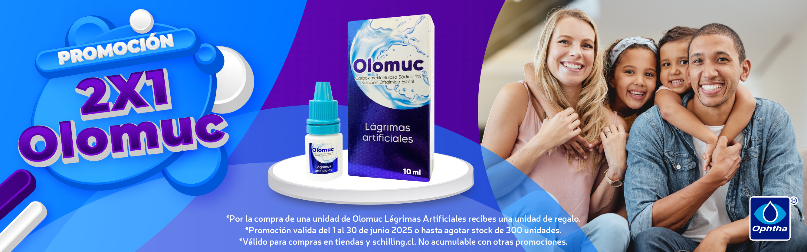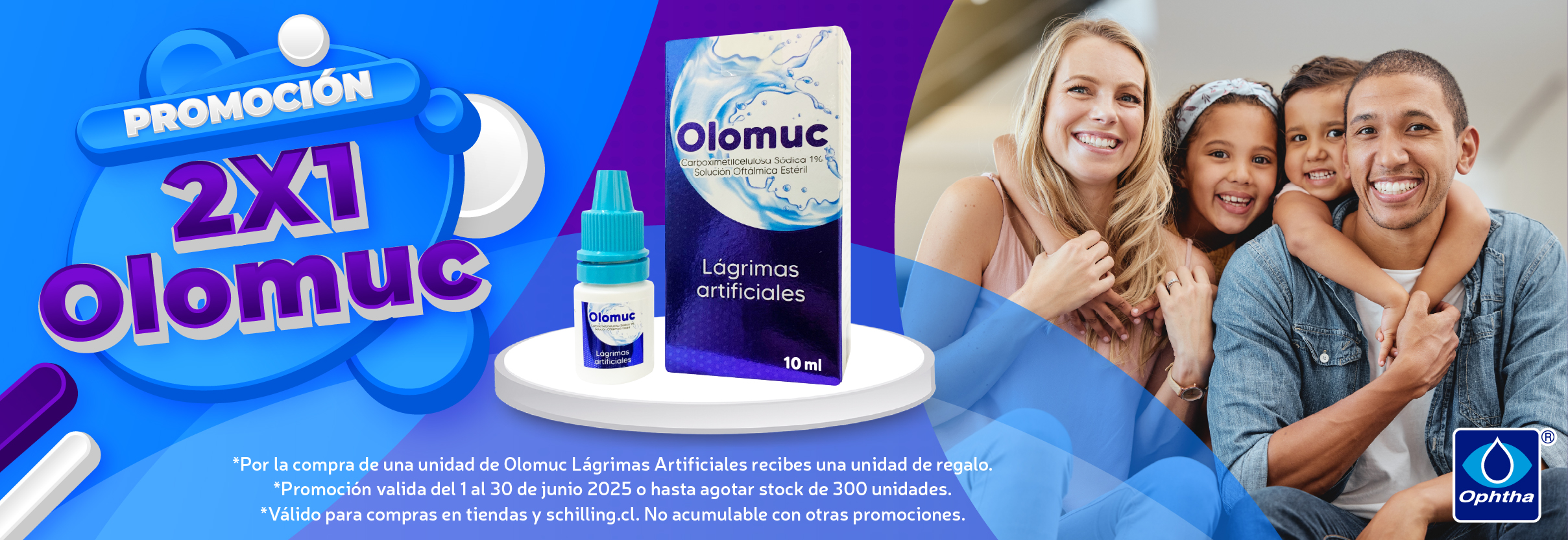 Obtén un 25% de descuento en la compra de cualquier producto de la línea ophtha (lágrimas Ophthacril, Olomuc, Dorfree, Sprainer espuma, Sprainer T4-0 y Atidex solución alargadora de pestañas). no acumulable con otras promociones. 300 unidades de todas las marcas participantes o hasta agotar stock. promoción valida del 1 al 30 de septiembre 2025, por compras en página web schilling.cl y en tiendas físicas.