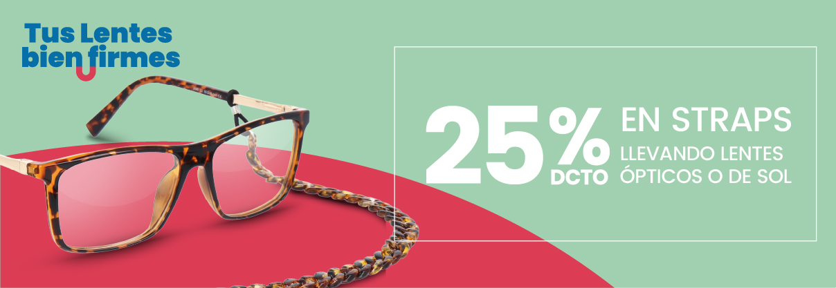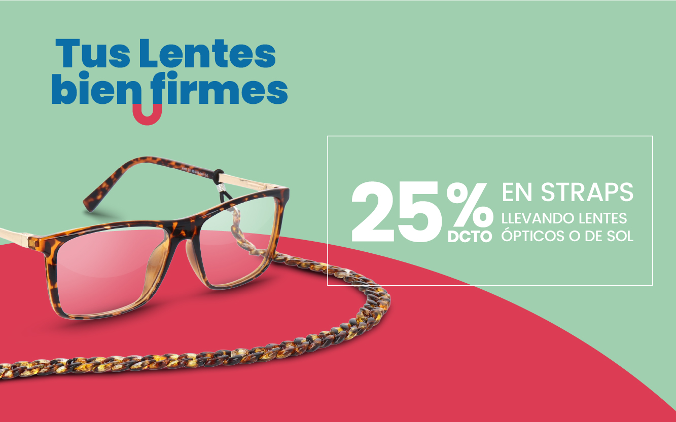 Por la compra de tus Lentes Ópticos, Lentes Ópticos de Sol o Lentes de Sol (Incluye todas las marca o tratamiento) Obtén un 25% de descuento en la compra de tu straps. Promoción válida del 25 de febrero al 30 de abril 2026 o hasta agotar stock de 5.000 unidades de straps. Publicidad válida para compras realizadas en tiendas ubicadas en territorio nacional y no en schilling.cl. No aplica a compras en sitios relacionados o Marketplace. Promoción no acumulable con otras ofertas y/o convenios. Lentes exhibido no necesariamente disponible en tienda.